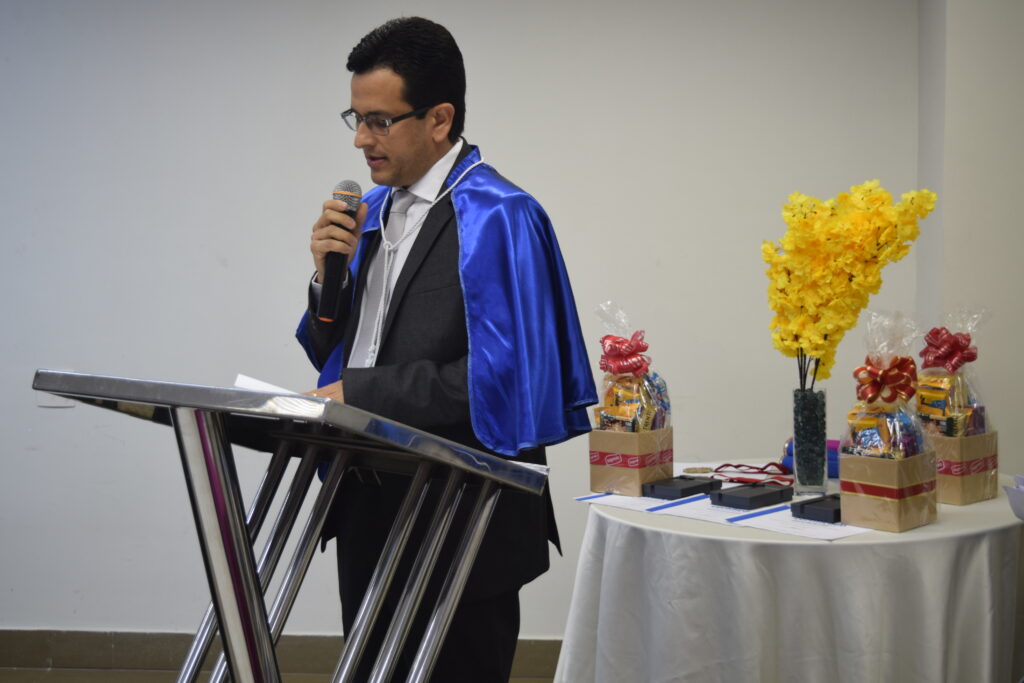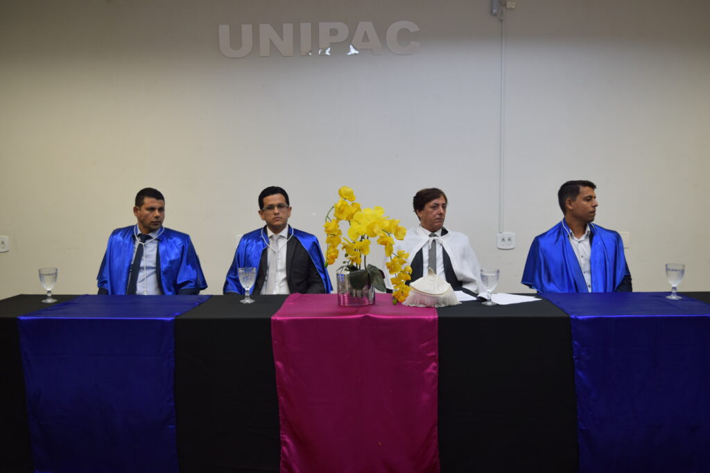A solenidade foi conduzida pelo Diretor Geral da UNIPAC, professor Rogério Primo, responsável por colar o grau dos concluintes, oficializando a conclusão da graduação.